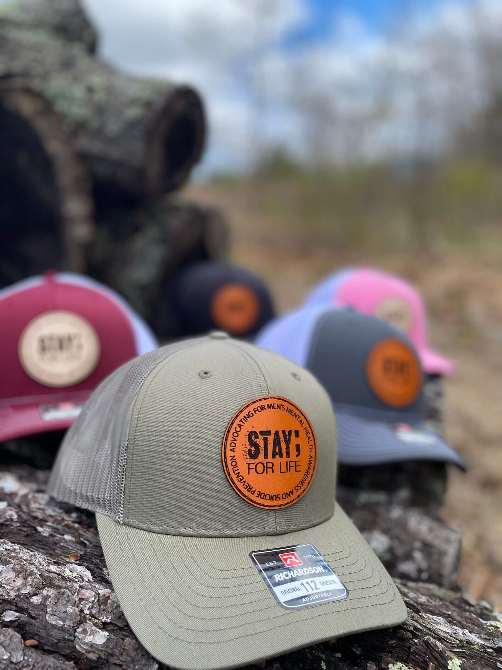 Our mesh “trucker” hat is Richardson snap back, featuring a 100% top grain leather patch, hand sewn onto the hat. The round patch is engraved with our traditional logo “Stay; For Life, advocating for men’s mental health awareness and suicide prevention”
